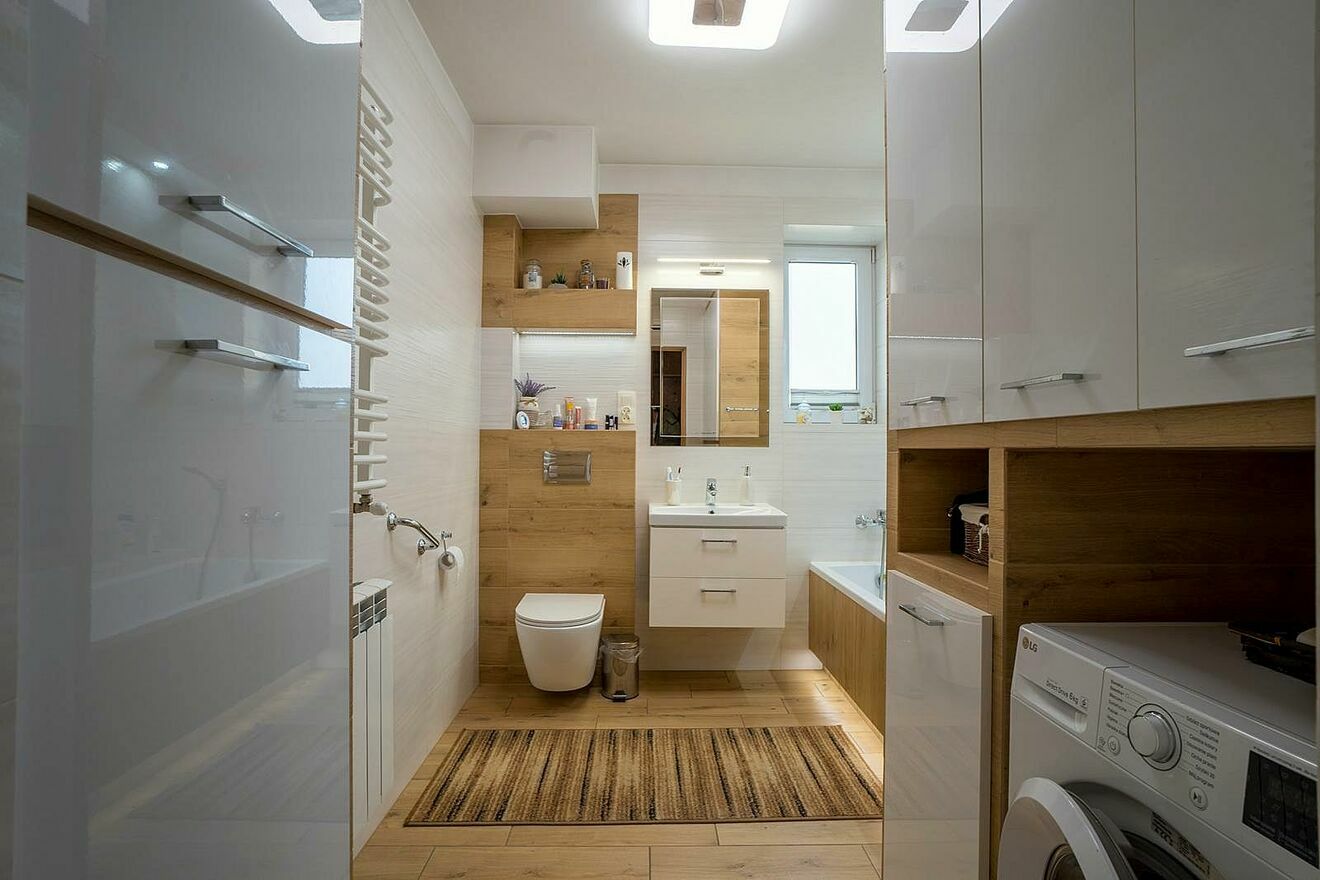 Kuchnia w zabudowie wraz ze sprzętem: zmywarka Beko, kuchenka gazowa z piekarnikiem elektrycznym Beko, okap Amica, lodówko-zamrażarka Samsung.